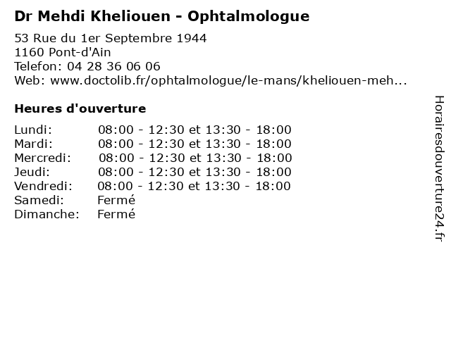 | Mercredi | 08:00-12:30 et 13:30-18:00 |