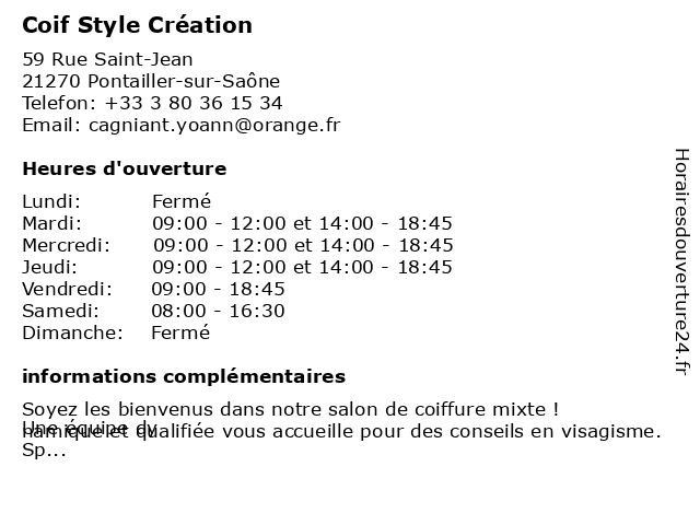 2 Bourgogne Images Création (Distance: 19,96 km) 3 route de Tart le Haut, 21110 Marliens bourgogne, brochures, création, création visuelle, flyers, images, posters, prise de vue 3 NewCo (Distance: 20,41 km) . Quai Mavia, 70100 Gray accessoires, chemise, mode, newco, pantalon, style, vetement 4 Ld Coif' (Distance: 25,46 km) 22 Route Nationale, 21170 Losne cheveux, coif', coiffeur, coiffure, domicile, femme, ld, mâle 5 Interview Coiffure (Distance: 26,37 km) 1 Rue Roland Dorgeles, 21600 Longvic beauté, coiffeur, coiffure, coupe de cheveux, interview, style 6 |