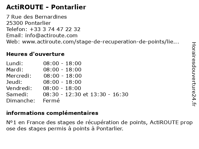 | Samedi | 08:30-12:30 et 13:30-16:30 |