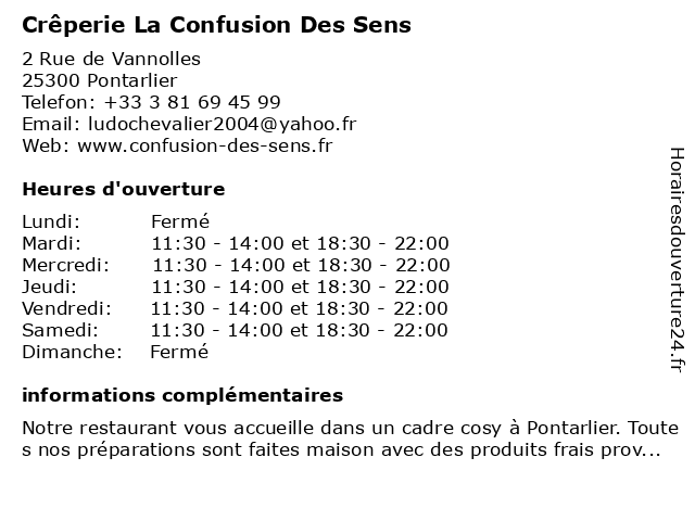 | Mardi | 11:30-14:00 et 18:30-22:00 |