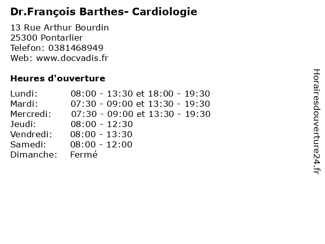 1 Cabinet Médical du Docteur Barthes (secrétariat ) (Distance: 0,00 km) 13 Rue Arthur Bourdin, 25300 Pontarlier barthes, cabinet, consultation, docteur, du, médecins, médical, santé, secrétariat 3 Dr François Wattelier - Médecin généraliste (Distance: 19,56 km) 24 Rue des Fauvettes, 25650 Gilley consultation, docteur, dr, françois, généraliste, med, médecin, médecine, traitement, wattelier 4 Cabinet de Cardiologie (secrétariat ) (Distance: 27,45 km) 35 rue Gustave Courbet, 25290 Ornans cabinet, cardiologie, consultation, de, docteur, santé, secrétariat 5 Cabinet médical du Dr Pélier - Cardiologie (secrétariat ) (Distance: 43,62 km) 10 rue de Faramand, 39600 Arbois cabinet, cardiologie, consultation, docteur, dr, du, médical, pélier, santé, secrétariat 6 Dr Enrica Dorigo -Chirurgien thoracique et cardio-vasculaire (Distance: 44,64 km) 2 place Saint-Jacques, 25030 Besançon besançon, cardio, cardiologie, cardiologue, centre, chirurgien, de, dorigo, dr, enrica, et, hospitalier, régional, thoracique, universitaire, vasculaire |