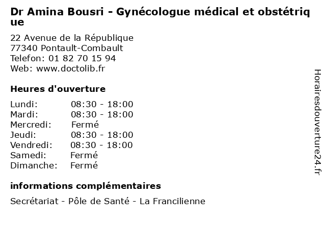 1 Dr Valérie Metang - Gynécologue obstétricien (Distance: 0,00 km) 22 Avenue de la République, 77340 Pontault-Combault de, docteur, dr, francilienne, generaliste, gynécologue, générale, la, medical, metang, obstétricien, pôle, ramsay, santé, soin, valérie 2 Cabinet Médical De La Place De L'Europe - Médecine générale (secrétariat ) (Distance: 0,83 km) - Allee de la Pierre Rouge, 77184 Emerainville cabinet, consultation, de, docteur, générale, l'europe, la, médecine, médical, place, santé, secrétariat 3 Cabinet médical du Docteur Veronique Baube (secrétariat ) (Distance: 4,53 km) 9 cours du buisson, 77186 Noisiel baube, cabinet, consultation, docteur, du, médecins, médical, santé, secrétariat, veronique 4 Cabinet Médical - Médecine générale (secrétariat ) (Distance: 4,53 km) 9 Cours du Buisson, 77186 Noisiel cabinet, consultation, docteur, générale, médecine, médical, santé, secrétariat 5 Dr Alexander Abankwa - Gynécologue médical et obstétrique (Distance: 5,13 km) 5 Rue de l'Abreuvoir, 94500 Champigny sur Marne abankwa, alexander, dr, et, gynécologue, médecin, médecine, médical, obstétrique, pharmaceutique, traitement 6 Dr Anja Nuel - Gynécologue médical et obstétrique (Distance: 5,13 km) 5 Rue de l'Abreuvoir, 94500 Champigny sur Marne anja, dr, et, gynécologue, médecin, médecine, médical, nuel, obstétrique, pharmaceutique, traitement |