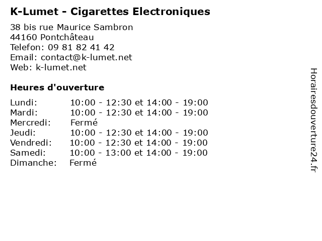 | Samedi | 10:00-13:00 et 14:00-19:00 |