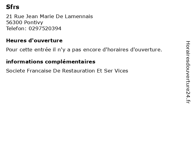1 Sfrs (Distance: 0,29 km) 6 Rue Theodore Botrel, 56300 Pontivy francaise, restaurants, restauration, ser, sfrs, societe, vices 2 Sfrs (Distance: 0,72 km) 29 Rue De l Abbe Martin, 56300 Pontivy francaise, restaurants, restauration, ser, sfrs, societe, vices 3 Sfrs (Distance: 6,54 km) Kerlebost , 56300 St Thuriau francaise, restaurants, restauration, ser, sfrs, societe, vices 4 Soc Fr De Restauration Et Sce (Distance: 6,54 km) Kerlebost , 56300 St Thuriau francaise, restaurants, restauration, sce, ser, societe, vices 5 Sfrs (Distance: 22,49 km) Place Anne De Bretagne, 56500 Locmine francaise, restaurants, restauration, ser, sfrs, societe, vices 6 Societe Berthe (Distance: 29,59 km) 1 Place Du General De Gaulle, 56440 Languidic berthe, boucheries, poissonneries, societe |