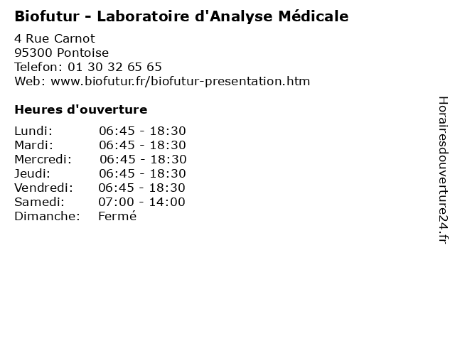 1 Biofutur - Laboratoire d'Analyse Médicale (Distance: 0,96 km) 2 Avenue du Général de Gaulle, 95310 Saint-Ouen-l'Aumône analyses, biofutur, d'analyse, laboratoire, medicales, médicale, services 2 Biofutur - Laboratoire d'Analyse Médicale (Distance: 4,98 km) 18 Place de la Liberté, 78700 Conflans-Sainte-Honorine analyses, biofutur, d'analyse, laboratoire, laboratoires, medical, médicale, services 3 Biofutur - Laboratoire d'Analyse Médicale (Distance: 5,71 km) 26 Boulevard Armand Leprince, 78700 Conflans-Sainte-Honorine France analyses, biofutur, d'analyse, laboratoire, laboratoires, medical, médicale, services 4 Biofutur - Laboratoire d'Analyse Médicale (Distance: 9,72 km) 188 Rue de Paris, 95150 Taverny analyses, biofutur, d'analyse, laboratoire, medicales, médicale, services 5 Biofutur - Laboratoire d'Analyse Médicale (Distance: 11,88 km) 7 Rue d'Achères, 78600 Maisons-Laffitte analyses, biofutur, d'analyse, laboratoire, laboratoires, medical, médicale, services 6 Biofutur - Laboratoire d'Analyse Médicale (Distance: 14,16 km) 19 Quai de l'Arquebuse, 78250 Meulan-en-Yvelines analyses, biofutur, d'analyse, laboratoire, laboratoires, medical, médicale, services |