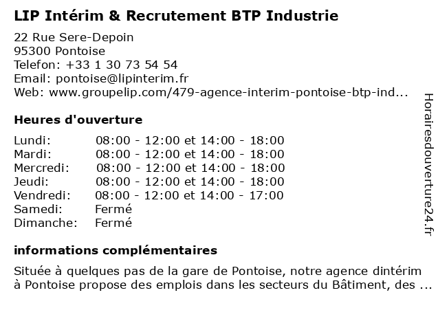 1 Artus Intérim CERGY PONTOISE (Distance: 0,03 km) 26 Rue Sere-Depoin, 95300 Pontoise artus, cergy, intérim, pontoise 2 Adéquat - Intérim & Recrutement (Distance: 0,03 km) 26 rue Seré Depoin, 95300 Pontoise adéquat, agence, emploi, fixe, interim, intérim, recherche, recrutement, temporaire 3 Agence d'Intérim Manpower Pontoise (Distance: 0,08 km) 10 Rue Thiers, 95300 Pontoise agence, agence de recrutement, agence intérim, agence pour l'emploi, cabinet de recrutement, cdi, d'intérim, intérim, manpower, pontoise, recrutement 4 Cabinet de Recrutement Manpower de Cergy-Pontoise (Distance: 0,08 km) 10 Rue Thiers, 95300 Pontoise agence de recrutement, agence pour l'emploi, cabinet, cabinet de recrutement, cdi, cergy, de, manpower, pontoise, recrutement 5 Ergalis Intérim (Distance: 0,09 km) 8 rue Séré Depoin, 95300 Pontoise agence, emploi, ergalis, fixe, interim, intérim, recherche, temporaire 6 Agence d'intérim Manpower Pontoise Recrutement (Distance: 0,10 km) 10 Rue Thiers, 95000 Pontoise agence de recrutement, agence intérim, agence pour l'emploi, cabinet de recrutement, cdi, intérim, recrutement |