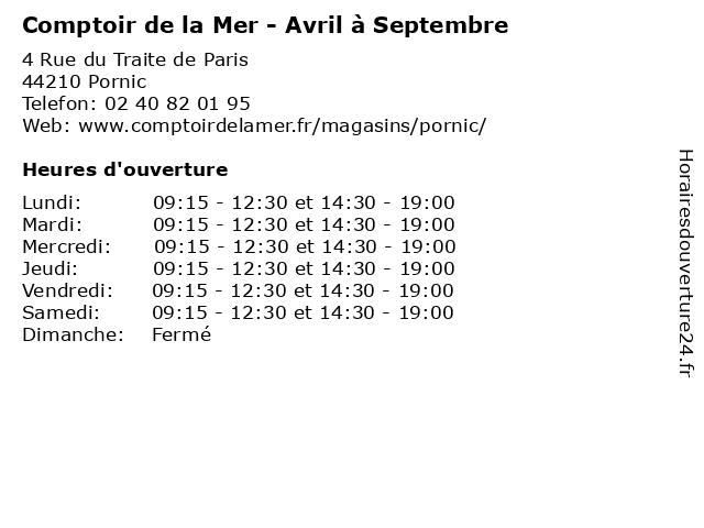 1 Comptoir de la Mer - Octobre à Mars (Distance: 0,00 km) 4 Rue du Traite de Paris, 44210 Pornic collections, comptoir, de, la, magasins, mars, mer, mode, nautisme, octobre, pêche 2 Ogec De Sainte Marie Sur Mer (Distance: 1,66 km) Ste Marie Sur Mer, 44210 Pornic marie, mer, ogec, restaurants, sainte 3 Camping Clos Mer et Nature - Réception en saison (Distance: 5,65 km) 103 route de Tharon, 44730 Saint-Michel-Chef-Chef camping, clos, en, et, loisirs, mer, nature, réception, saison, tourisme, vacances 4 Camping Clos Mer et Nature - Réception hors saison (Distance: 5,65 km) 103 route de Tharon, 44730 Saint-Michel-Chef-Chef camping, clos, et, hors, loisirs, mer, nature, réception, saison, tourisme, vacances 5 La Mer Veille (Distance: 15,15 km) 30 Avenue Georges Clemenceau, 85330 Noirmoutier-en-l'Île bar, bistro, bistrot, brasserie, café, la, mer, restaurant, restauration, veille 6 Hotel Autre Mer (Distance: 16,63 km) 32 Avenue Joseph Pineau, 85330 Noirmoutier autre, bar, hotel, mer, restaurant, service |
