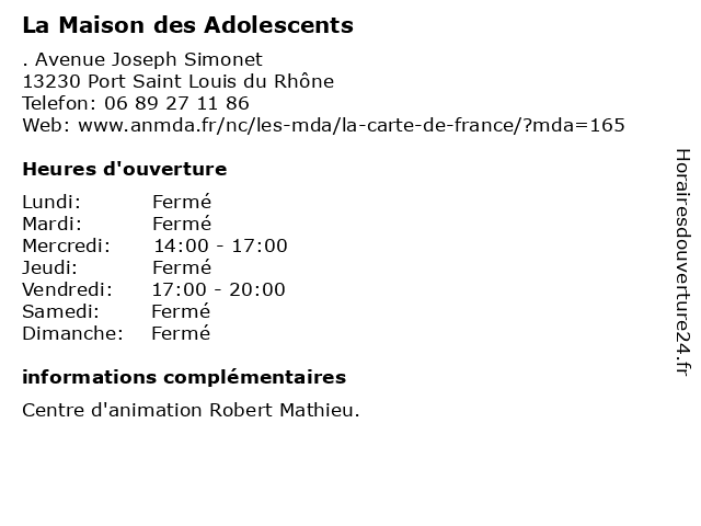 1 La Maison des Adolescents (Distance: 26,96 km) 15 rue Albert Camus, 13140 Miramas accueil, adolescent, adolescents, aide, anonymat, association, de, des, difficulte, gratuit, l'adolescent, la, maison, multidisciplinaire, parler, prevention, psychologique, sante, solitude 2 The Originals City, Hôtel Marseille Aéroport (Distance: 35,86 km) 2 Rue de Madrid, 13127 Vitrolles aéroport, chambres rénovées, city, hôtel, marseille, navette aeroport, originals, parking gratuit, petit déjeuner buffet, restaurant, salle de réunion, soirée étape, the, tourisme, wifi 3 La Maison des Adolescents (Distance: 35,96 km) 94 rue Labadie, 13300 Salon de Provence accueil, adolescent, adolescents, aide, anonymat, association, de, des, difficulte, gratuit, l'adolescent, la, maison, multidisciplinaire, parler, prevention, psychologique, sante, solitude 4 Centrale de Funéraire (Distance: 44,36 km) 159 Avenue de la Viste, 13015 Marseille articles funéraires, centrale, contrats obsèques, de, devis gratuit, funéraire, organisation d'obsèques, rapatriement, travaux de marbrerie 5 Les Opticiens Mutualistes (Distance: 44,45 km) - Avenue Albert Manoukian,, 13480 CABRIES lentilles, les, marques, mutualistes, opticiens, vision et prevention 6 Centre médico-psychologique (Distance: 44,58 km) 19 Avenue Gabriel Péri, 13560 Sénas centre, médico, psychologique |