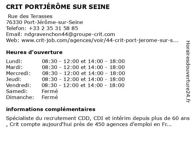 1 Crit Job (Distance: 0,22 km) 2 Notre Dame De Gravenchon, 76330 Port-Jérôme-sur-Seine crit, intérim, job, recrutement 3 4 Crit Sainte Marie des Champs (Distance: 21,16 km) 25 Avenue René Coty, 76190 Sainte-Marie-des-Champs champs, crit, des, marie, sainte 6 Crit Interim (Distance: 32,99 km) n/a Route du Havre, 76430 Tancarville agence, crit, emplois, interim, job, professionnelle, qualifications, recherche |