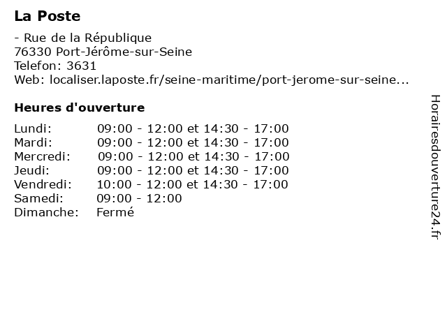 2 La Poste (Distance: 1,76 km) - Avenue du Château, 76330 Port-Jérôme-sur-Seine la, la poste, notre dame de gravenchon, poste 3 La Poste (Distance: 3,73 km) - Rue du 8 Mai 1945, 76170 Lillebonne express chronopost, la, poste, réexpédition internationale 4 La Poste (Distance: 3,77 km) 39 Rue Félix Faure, 76170 La Frenaye express chronopost, la, poste, réexpédition internationale 5 La Poste (Distance: 8,60 km) - Place De La Mairie, 27680 Sainte Opportune La Mare express chronopost, la, poste, réexpédition internationale 6 La Poste (Distance: 12,97 km) - Le Bourg, 76210 Nointot agence, assurance, banque, banque postale, bureau de poste, chronopost, colis, courrier, dps, expéditions internationales, la, point, postale, poste, relais, timbres, téléphonie, ups, western union |