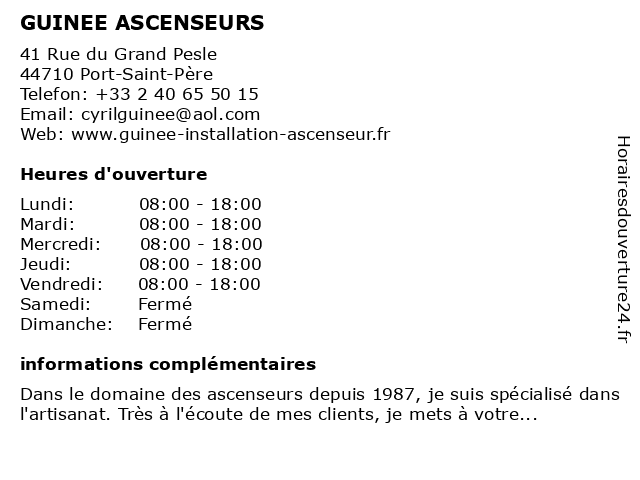 1 Koné (Distance: 16,33 km) 3 rue des Coquelicots, 44840 Les Sorinières agence, ascenseurs sur mesure, installation, kone, koné, maintenance, modernisation équipements 2 Otis (Distance: 21,44 km) 1 rue du Tertre, 44472 Carquefou agence, ascenseurs, maintenance, otis, services 3 Guinee Maxime SARL (Distance: 38,86 km) 27 Rue Claude Bernard, 44600 Saint-Nazaire guinee, maxime, sarl 4 Actis Location (Distance: 59,21 km) - Parc d'activités La Landette 2, 85430 Aubigny-les-Clouzeaux accessoires, actis, ascenseurs, automotives, gerbeurs, location, manutention, plateformes de travail aériennes, réservoirs, services, transpalettes, équipement de stockage |