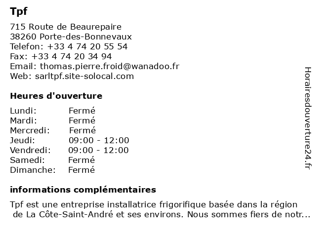1 La Voile Blanche (Distance: 41,08 km) Plan d Eau De, 01300 Murs Et Gelignieux blanche, murs, restaurants, tpf, voile 2 TPF-I - L'ingénierie co-créative (Distance: 44,81 km) 55 rue de la Villette, 69003 Lyon acoustique, co, créative, diagnostic, groupe, ingénierie, l'ingénierie, thermique, tpf, électrique 3 Thermique Plomberie Finet (TPF) (Distance: 49,88 km) 12 Rue Général Ferrié, 38100 Grenoble batiment, depannage, finet, plomberie, renovation, thermique, tpf |