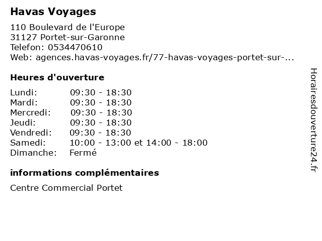 1 Havas Voyages (Distance: 6,91 km) 52 Avenue Tolosane, 31520 Ramonville Saint Agne agence, havas, services, voyages 4 Havas Voyages (Distance: 9,05 km) 700 La Pyreneenne, 31670 Labege agence, circuits, havas, hotel, réservation, séjours, voyages 5 Havas Voyages (Distance: 9,50 km) 27 Rue du Centre, 31770 Colomiers agence, havas, organisation, séjours, tourisme, voyage, voyages 6 Carrefour Voyages (Distance: 1,46 km) . Boulevard de l'Europe, 31127 Portet-sur-Garonne agences, carrefour, location, vacances, voyages |