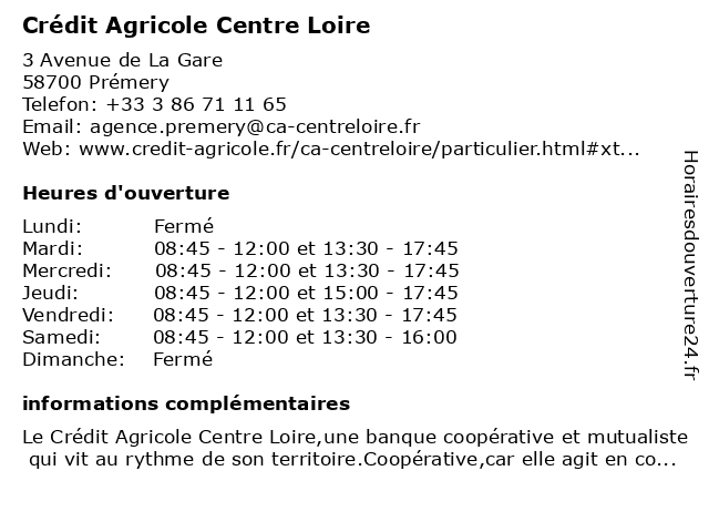 1 Crédit Agricole Centre Loire (Distance: 14,19 km) 18 Grande Rue, 58130 Guérigny agricole, centre, crédit, loire 2 Crédit Agricole Centre Loire (Distance: 16,96 km) Route de Saint-Reverien, 58420 Brinon-sur-Beuvron agricole, centre, crédit, loire 3 Crédit Agricole Centre Loire - Saint Saulge (Distance: 15,45 km) 13 Rue du Champ de Foire, 58330 Saint-Saulge agricole, centre, crédit, loire, saint, saulge 4 Crédit Agricole Centre Loire - Saint Benin d'Azy (Distance: 15,45 km) Rue du Champ de Foire, 58270 Saint-Benin-d'Azy agricole, benin, centre, crédit, d'azy, loire, saint 5 Lycée Professionnel Agricole Cœur de Nièvre (Distance: 15,66 km) - Place Domaine de Laveyne, 58330 Saint-Saulge agricole, cœur, de, enseignement, lycée, nièvre, professionnel, saint-saulge, sos 6 Crédit Agricole Centre Loire (Distance: 21,21 km) 6 Place du Marché, 58210 Varzy agricole, centre, crédit, loire |