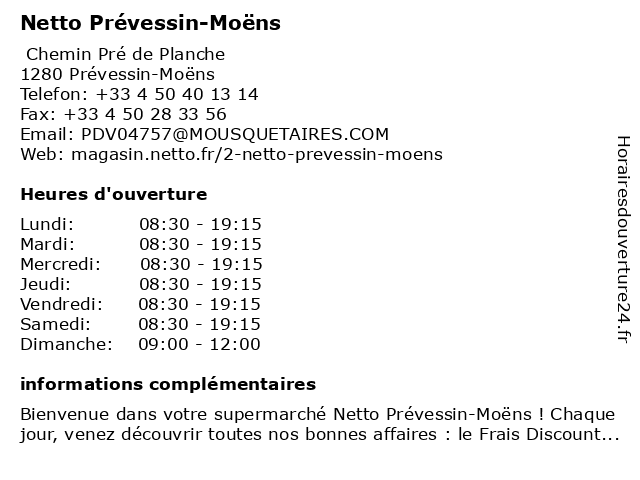 2 Netto La Roche-sur-Foron (Distance: 25,47 km) 92 Avenue Jean Morin, 74800 La Roche-sur-Foron foron, la, netto, roche, sur 4 Netto (Distance: 31,36 km) - La Crettiaz, 74490 Saint-Jeoire achats de produits alimentaires, des prix bas, grands supermarchés, hard discount, netto, supermarchés 6 Netto La Balme De Sillingy (Distance: 31,91 km) 3 Route d'Avully, 74330 La Balme-de-Sillingy balme, de, la, netto, sillingy |