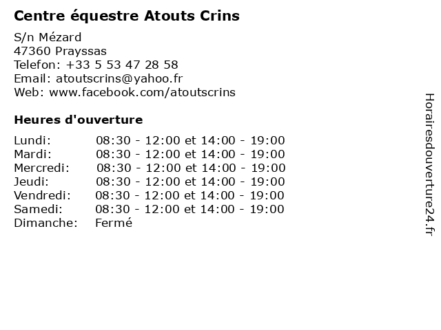| Samedi | 08:30-12:00 et 14:00-19:00 |