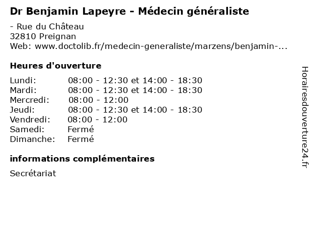 | Lundi | 08:00-12:30 et 14:00-18:30 |