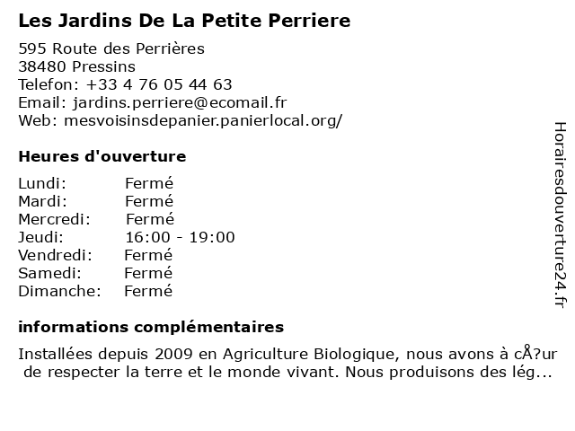 1 Les Jardins De La Petite Perriere (Distance: 0,00 km) 595 Route des Perrières, 38480 Pressins de, jardins, la, les, perriere, petite 2 Les Jardins De La Petite Perriere (Distance: 0,00 km) 595 Route des Perrières, 38480 Pressins de, jardins, la, les, perriere, petite 3 Les Jardins Du Buis (Distance: 3,31 km) 8 Place Carrouge, 73330 Le Pont-de-Beauvoisin buis, du, jardins, les 4 Passion Jardins (Distance: 4,09 km) 95 Lotissement les Vergeys, 38480 Saint-Jean-d'Avelanne jardins, passion 6 Rat Patron Jardins (Distance: 16,98 km) 200 Route de la Quillère, 73160 Saint-Thibaud-de-Couz jardins, patron, rat |