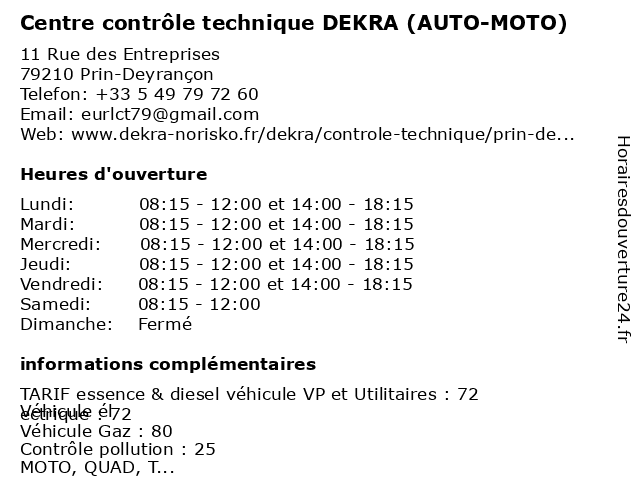 Description de l'entreprise :Préparer votre contrôle techniquePour préparer votre contrôle technique dans notre centre DEKRA de Prin-Deyrançon, vous pouvez vérifier en amont différents points comme les pneumatiques, la visibilité, le niveau d'huile ou encore l'habitacle. Pour tout savoir, consultez notre vidéo. Voir l'offre |