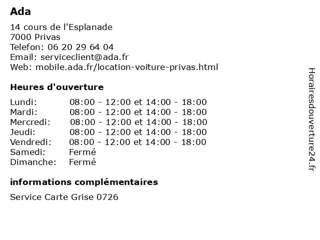 1 Ada (Distance: 12,72 km) - Route de Loriol, 07250 Le Pouzin ada, agence, location, services, utilitaires, voitures, voyages 2 Ada (Distance: 16,48 km) 441 rue de la Plasturgie, 26270 Loriol Sur Drome ada, agence, location, utilitaires, voitures, véhicules 3 ADA (Distance: 19,89 km) 6 Quartier des Ramieres, 07800 Beauchastel ada, agence, location, utilitaires, voitures 4 ADA (Distance: 20,21 km) 121 ZA de Chamboulas, 07200 Ucel ada, agence, location, utilitaires, voitures 5 ADA (Distance: 21,52 km) 1 Rue Vaucanson, 07200 Aubenas ada, auto, location de voiture, roulez, vehicules 6 ADA (Distance: 22,74 km) - Avenue de l'Europe Unie, 07400 Le Teil ada, agence, location, utilitaires, voitures |