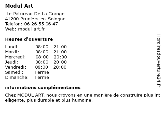 Termes de recherche pour Modul Art:art, modul, constructeur de maisons, consultant en gestion d'entreprise, fournisseur de matériaux pour le bâtiment, restauration de bâtiments |