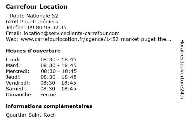 1 Carrefour Market (Distance: 0,36 km) - Quartier Saint-Roch, 06260 Puget-Theniers alimentaire, alimentation, carrefour, courses, distributeur, hypermarché, market, supermarché, épicerie 2 Carrefour Drive (Distance: 0,70 km) - Quartier Saint Roch, 06260 Puget-Théniers alimentaire, carrefour, courses, drive, en ligne, magasin 3 Intermarché location Entrevaux (Distance: 8,80 km) D4202, 04320 Entrevaux entrevaux, intermarché, location 4 Intermarché location Entrevaux (Distance: 8,81 km) Cournillons, 04320 Entrevaux entrevaux, intermarché, location 5 Ekosport-Rent Sandia Sports - Location de ski (Distance: 15,62 km) 12 Avenue de Valberg, 06470 Péone de, ekosport, entretien de skis, equipement de ski, location, location de ski, location de ski armada, location de ski faction, location de ski freeride, location de ski freestyle, location de ski movement, location de ski touring, location de ski valberg, location de snowboard, location de snowboard valberg, location ski de randonnée, location ski pour enfant, louer des skis, louer des skis valberg, magasin de ski valberg, rent, sandia, ski, ski freeride, ski freestyle, sports, valberg 6 Carrefour Station Service (Distance: 18,36 km) - Route Nationale 202, 06260 Puget-Théniers carburant, carrefour, essences, gazole, service, services, station |