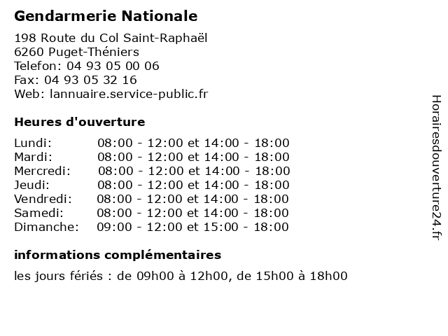1 Gendarmerie Nationale (Distance: 15,80 km) 33 Avenue de Valberg, 06470 Péone brigade, commandant, communauté, gendarme, gendarmerie, nationale, proximité, sécurité 2 Gendarmerie Nationale (Distance: 29,06 km) 68 Rue du Docteur Maffet, 06620 Le Bar-sur-Loup brigade, commandant, communauté, gendarme, gendarmerie, nationale, proximité, sécurité 3 Gendarmerie Nationale (Distance: 31,25 km) - Route de Nice, 04170 Saint-André-les-Alpes brigade, commandant, communauté, gendarme, gendarmerie, nationale, proximité, sécurité 4 Gendarmerie Nationale (Distance: 31,32 km) - Route de la Colmiane, 06450 Saint-Martin-Vésubie brigade, commandant, communauté, gendarme, gendarmerie, nationale, proximité, sécurité 5 Gendarmerie Nationale (Distance: 33,32 km) n/a Route d'Allos, 04370 Colmars brigade, commandant, communauté, gendarme, gendarmerie, nationale, proximité, sécurité 6 Gendarmerie Nationale (Distance: 33,40 km) 78 Rue Droite, 06660 Saint-Étienne-de-Tinée brigade, commandant, communauté, gendarme, gendarmerie, nationale, proximité, sécurité |