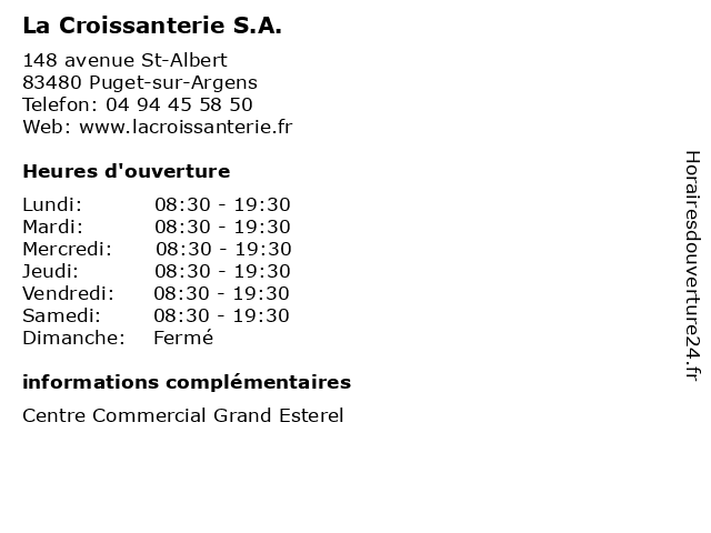 1 La Croissanterie (Distance: 3,30 km) 480 Rue Eugène Joly, 83600 Fréjus accessoires, beaute&sante, cafe, chaussures, croissanterie, enfants, la, mode femmes, mode hommes, optique, restaurant, service, sport 2 La Croissanterie (Distance: 13,99 km) - Autoroute A8, 83600 Les Adrets boulangerie, croissanterie, la, viennoiseries 3 Le Bar à Pâtes (Distance: 0,00 km) 148 avenue St-Albert, 83480 Puget-sur-Argens bar, boulanger, boulangerie, gâteaux, le, pain, petits pains, pâtes 4 La Table du Boulanger (Distance: 20,72 km) 791 avenue de Fréjus, 06210 Mandelieu-la-Napoule boulanger, boulangerie, du, gâteaux, la, pain, petits pains, table 5 Histoire de Pains (Distance: 30,07 km) 159 route du Plan, 06130 Grasse boulanger, boulangerie, de, histoire, pains, patisserie 6 Boulanger (Distance: 35,25 km) 2111 Route de Grasse, 06600 Antibes boulanger, console, cuisine, jeux, multimédia, télévision, électroménager |