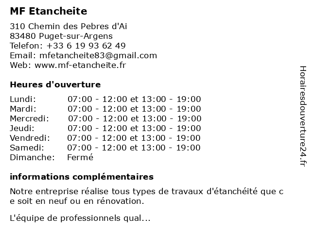 | Samedi | 07:00-12:00 et 13:00-19:00 |