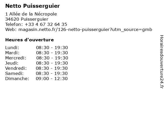 1 Netto Puisserguier (Distance: 0,01 km) Chemin de la Rouquette, 34620 Puisserguier netto, puisserguier 2 Netto (Distance: 31,76 km) 9 boulevard Sarrazin, 34120 Pézenas achats de produits alimentaires, des prix bas, grands supermarchés, hard discount, netto, supermarchés 5 Netto (Distance: 43,42 km) - Souc, 34800 Clermont-l'Hérault achats de produits alimentaires, des prix bas, grands supermarchés, hard discount, netto, supermarchés 6 |