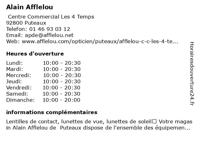 1 Alain Afflelou (Distance: 5,24 km) 67 Boulevard de la République, 92210 Saint Cloud afflelou, aide auditive, alain, appareil auditif, opticien, prothèses auditive 2 Alain Afflelou (Distance: 6,68 km) 82 Boulevard Haussmann, 75008 PARIS afflelou, alain, cabinet d'ophtalmologie, magasin de lunettes de soleil, ophtalmologie, optométrie 3 Alain Afflelou (Distance: 8,65 km) Centre Commercial Forum Des Halles, 75001 PARIS afflelou, alain, magasin de lunettes de soleil, magasin d’accessoires de mode, optométrie 4 Alain Afflelou (Distance: 9,48 km) 50 Avenue Du General Leclerc, 75014 Paris accessoires, afflelou, alain, lentilles de contact, lunettes, opticien, optique 5 Alain Afflelou (Distance: 10,09 km) 72 bis avenue de Flandres, 75019 Paris afflelou, aide auditive, alain, appareil auditif, opticien, prothèses auditive 6 Alain Afflelou (Distance: 11,78 km) 121 Avenue d'Italie, 75013 Paris afflelou, alain, glasses, optician, store |