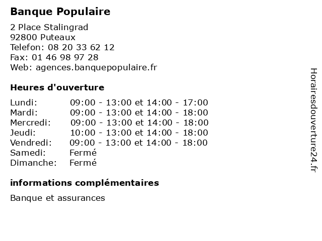 1 Banque Populaire (Distance: 0,62 km) 88 avenue du 18 Juin 1940, 92500 Rueil Malmaison assurances, banque, bred, populaire 2 Banque Populaire (Distance: 0,78 km) 9 rue du Docteur Marc Bombiger, 92150 Suresnes agence, assurance, bancaire, banque, populaire 3 Banque Populaire (Distance: 3,24 km) 1 Boulevard Jean Jaurès, 92100 Boulogne agence, assurance, bancaire, banque, populaire 4 5 Banque Populaire (Distance: 5,01 km) 146-146 rue du Point du Jour, 92100 Boulogne-Billancourt agence, assurance, bancaire, banque, populaire 6 Banque Populaire (Distance: 5,87 km) 17 rue Madeleine Michelis, 92200 Neuilly-sur-Seine agence, assurance, bancaire, banque, populaire |