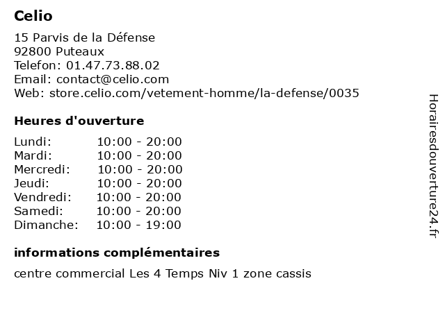 1 Celio (Distance: 0,00 km) 15 Parvis de la Défense, 92800 Puteaux accessoires, celio, habillement, homme, mode 2 Celio (Distance: 4,37 km) 31 Rue d'Alsace, 92300 Levallois-Perret accessoires, celio, mode, prêt-à-porter, vêtements 3 Celio (Distance: 6,17 km) 143 Boulevard Jean Jaurès, 92100 Boulogne-Billancourt accessoires, celio, chemises, costumes, mode, vêtements 4 Celio (Distance: 6,53 km) 1 Cour de Rome, 75008 Paris alimentation, beauté & sante, celio, culture & loisirs, enfants, high-tech, maison & déco, mode, restaurants 6 Celio (Distance: 6,71 km) 13 Rue d'Amsterdam, 75008 Paris cafe, celio, chaussures, enfants, homme, mode femme, restaurant, service, sport  |
