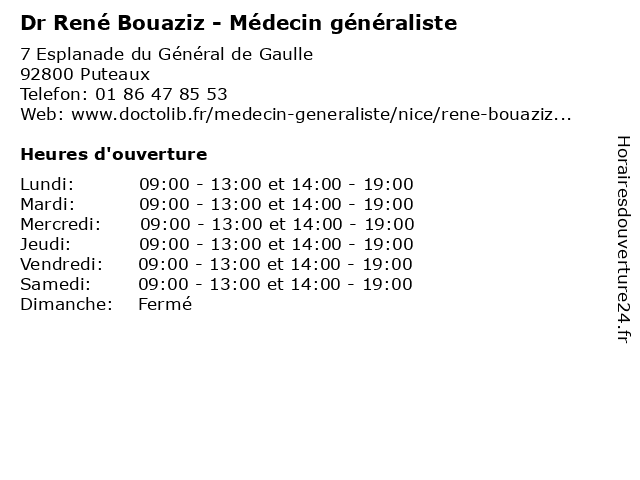 1 Dr René Bouaziz - Médecin généraliste (Distance: 6,92 km) 4 Rue du Docteur Roux, 75015 Paris bouaziz, consultation, docteur, dr, générale, généraliste, libre, medecins, médecin, médecine, paul, rené, santé 2 Dr Jérôme Bouaziz - Gynécologue obstétricien (Distance: 0,24 km) 2 Place des Reflets, 92400 Courbevoie bebe, bouaziz, dr, gynecologie, gynécologue, jérôme, maternite, obstetrique, obstétricien 3 Dr Lea Bouaziz - Chirurgien-dentiste (Distance: 3,57 km) 116 Boulevard Pereire, 75017 Paris bouaziz, chirurgien, consultation, dentiste, docteur, dr, lea, med, médecin, médecine, traitement 4 Dr René Levy - Chirurgien-dentiste (Distance: 5,60 km) 8 Avenue de Saint-Ouen, 75018 Paris chirurgien, consultation, dentiste, docteur, dr, levy, med, médecin, médecine, rené, secrétariat, traitement 5 Dr Emmanuel Bouaziz - Chirurgien-dentiste (Distance: 5,73 km) 80 Rue des Entrepreneurs, 75015 Paris bouaziz, chirurgie, chirurgien, dentaire, dentiste, dr, emmanuel 6 Dr Romain Bouaziz - Chirurgien-dentiste (Distance: 6,42 km) 51 Boulevard Victor Hugo, 93400 Saint-Ouen bouaziz, chirurgien, dentaire, dentiste, dr, implantologie, parodontologie, romain |