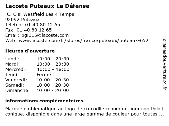 Termes de recherche pour Lacoste Puteaux La Défense:la, defense, maroquinerie, lacoste, articles de sport, magasin de chaussures, puteaux, magasin de vêtements pour enfants, magasin de vêtements pour hommes, magasin de vêtements pour femmes, magasin de vêtements de sport, magasin d’accessoires de mode |