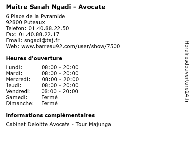 1 Maître Sarah Damour - Avocate (Distance: 0,00 km) 6 Place de la Pyramide, 92800 Puteaux avocate, avocats, civils, damour, droits, juridiques, maître, sarah 2 Maître Sarah Gabaly - Avocate (Distance: 0,00 km) 6 Place de la Pyramide, 92800 Puteaux avocate, avocats, civils, droits, gabaly, juridiques, maître, sarah 3 Maître Sarah Postel-Vinay - Avocate (Distance: 0,00 km) 6 Place de la Pyramide, 92800 Puteaux avocate, avocats, civils, droits, juridiques, maître, postel, sarah, vinay 4 Maître Sarah Vaillant - Avocate (Distance: 0,00 km) 6 Place de la Pyramide, 92800 Puteaux avocate, avocats, cabinet, conseils, contentieux, juridique, justice, litiges, maître, sarah, services, vaillant 5 Maître Sarah Lezer - Avocate (Distance: 0,00 km) 6 Place de la Pyramide, 92800 Puteaux avocate, avocats, civils, droits, juridiques, lezer, maître, sarah 6 Maître Sarah Keyhani - Avocate (Distance: 0,20 km) 20 avenue André Prothin, 92400 Courbevoie avocate, avocats, cabinet, conseils, contentieux, juridique, justice, keyhani, litiges, maître, sarah, services |