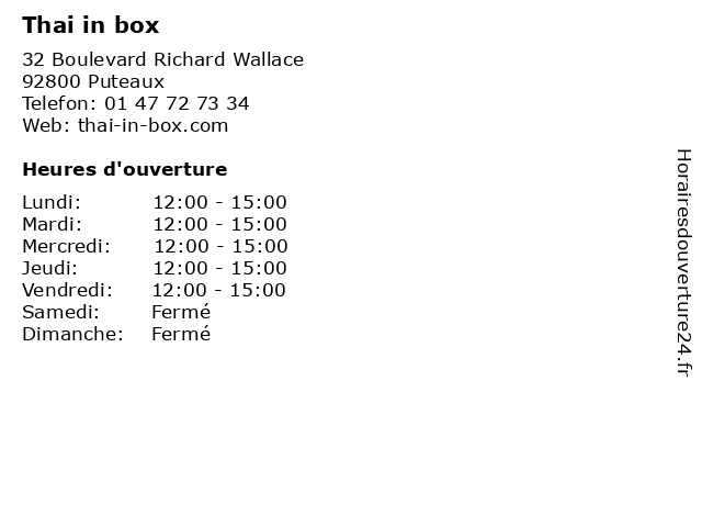 1 Thai in box (Distance: 1,68 km) 17 rue de l’abreuvoir, 92400 Courbevoie box, dessert, drinks, food, in, restaurant, thai 2 Thai in box (Distance: 3,69 km) 18 Avenue de l’Europe, 92300 Levallois-Perret box, dessert, drinks, food, in, restaurant, thai 3 Thai in box (Distance: 4,34 km) 39 boulevard Jean Jaurès, 92100 Boulogne-Billancourt box, dessert, drinks, food, in, restaurant, thai 4 Thai In Box (Distance: 4,58 km) 44 Rue Jean Le Coz, 92500 Rueil Malmaison bar, box, chateau, in, kena, restaurants, thai 5 Thai in box (Distance: 5,44 km) 18 rue du fief, 92100 Boulogne-Billancourt box, dessert, drinks, food, in, restaurant, thai 6 Thai in box (Distance: 7,91 km) 2 rue Papillon, 75009 Paris box, dessert, drinks, food, in, restaurant, thai |