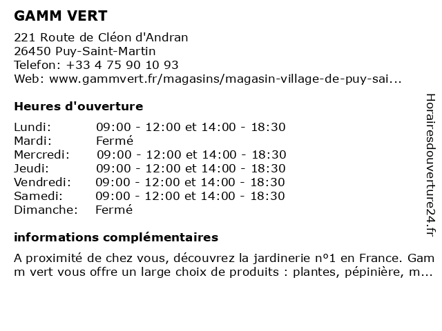 1 Gamm vert (Distance: 3,09 km) 690 Avenue Résistance de la Deportation, 26450 Cléon-d'Andran animalerie, gamm, jardin, jardinerie, mobilier de jardin, plantes, pépinière, vert 2 GAMM VERT (Distance: 12,25 km) Avenue Georges Clemenceau, 26400 Crest animalerie, gamm, jardin, jardinerie, mobilier de jardin, plantes, pépinière, vert 4 Gamm vert (Distance: 12,99 km) Les Moulins, 26220 Dieulefit animalerie, gamm, jardin, jardinerie, mobilier de jardin, plantes, pépinière, vert 5 GAMM VERT (Distance: 18,09 km) Allée des Crozes, 26270 Loriol-sur-Drôme animalerie, gamm, jardin, jardinerie, mobilier de jardin, plantes, pépinière, vert 6 GAMM VERT VILLAGE (Distance: 0,00 km) 221 Route de Cléon d'Andran, 26450 Puy-Saint-Martin gamm, vert, village |