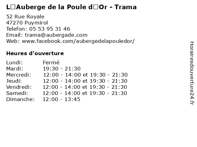 Termes de recherche pour L’Auberge de la Poule d’Or - Trama:d’or, la, café, de, bar, menus, bistrot, brasserie, restaurants, l’auberge, poule, trama |