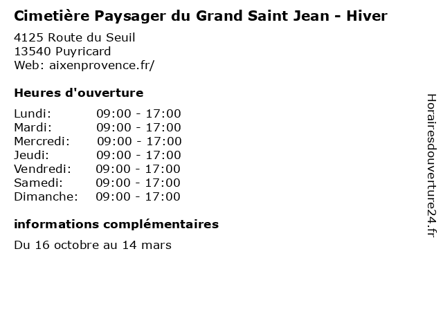 1 Cimetière Paysager du Grand Saint Jean - Ete (Distance: 0,48 km) 4125 Route du Seuil, 13540 Puyricard arbre, cimetière, cimetiere, cimetière, du, espace vert, ete, forêt, funeraire, grand, jardin, jean, loisirs, nature, parc, paysagé, paysager, prairie, saint, square 2 Domaine du Grand Saint Jean - Janvier, Novembre-Décembre (Distance: 3,01 km) - Route de Rognes, 13540 Aix-en-Provence arbre, domaine, du, décembre, espace vert, forêt, grand, janvier, jardin, jean, loisirs, nature, novembre, parc, prairie, saint, square 3 Domaine du Grand Saint Jean - Février (Distance: 3,01 km) - Route de Rognes, 13540 Aix-en-Provence arbre, domaine, du, espace vert, forêt, février, grand, jardin, jean, loisirs, nature, parc, prairie, saint, square 4 Domaine du Grand Saint Jean - Mars (Distance: 3,01 km) - Route de Rognes, 13540 Aix-en-Provence arbre, domaine, du, espace vert, forêt, grand, jardin, jean, loisirs, mars, nature, parc, prairie, saint, square 5 Domaine du Grand Saint Jean - Mai, Août (Distance: 3,01 km) - Route de Rognes, 13540 Aix-en-Provence août, arbre, domaine, du, espace vert, forêt, grand, jardin, jean, loisirs, mai, nature, parc, prairie, saint, square 6 Atelier de Saint Cannat (Distance: 3,62 km) 5130 Route d'Avignon, 13540 Aix-en-Provence anciens, atelier, cannat, de, matériaux, saint |