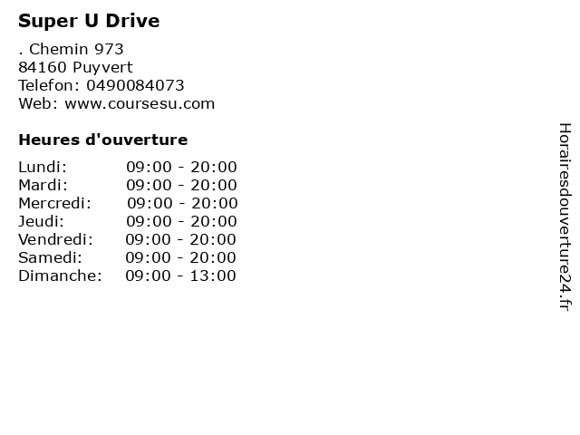 1 Super U Drive (Distance: 18,31 km) . Boulevard Jean Guigues, 84120 Pertuis drive, marche, services, super, supermarche 3 Super U Station Service (Distance: nan km) . Chemin 973, 84160 Puyvert essences, oil, service, services, station, stations essences, super 6 Intermarché SUPER Lambesc (Distance: 12,68 km) Avenue Jean Monnet, 13410 Lambesc intermarché, lambesc, super |