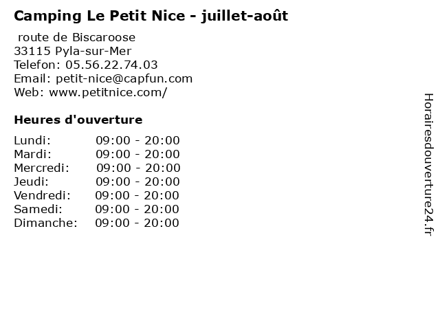 1 Camping Forêt du Pilat - Tohapi (Réception, haute saison) (Distance: 0,04 km) - Route de Biscarrosse, 33115 Pyla Sur Mer camping, du, forêt, haute, hebergement, pilat, réception, saison, tohapi, tourisme 2 Camping Forêt du Pila - Tohapit (Réception, basse saison) (Distance: 0,04 km) - Route de Biscarrosse, 33115 Pyla Sur Mer basse, camping, du, forêt, hebergement, pila, pilat, réception, saison, tohapi, tohapit, tourisme 3 Camping Petit Nice (Réception, juillet et août) (Distance: 4,03 km) - Route de Biscarosse, 33115 Pyla sur Mer août, camping, et, hebergement, juillet, nice, petit, réception, tourisme 4 Kid Parc - 7 juillet au 31 août (Distance: 4,91 km) 131 Route des Lacs, 33470 Gujan-Mestras 31, août, attractions, au, juillet, kid, loisirs, parc, restauration, tourisme 5 Bibliotheque - La Centrale - Juillet et Août (Distance: 5,09 km) 2 allée Clémenceau, 33260 La Teste de Buch 1ᵉʳ, 10, août, au, bibliotheque, cd, centrale, dvd, et, juillet, la, la centrale, livres, revues, septembre 6 Mutuelle Santé Ociane (Du 06 juillet au 30 août) (Distance: 5,36 km) 1-3 Rue Pierre Dignac, 33260 La Teste De Buch 06, 30, août, assurances, au, du, juillet, mutuelle, mutuelle sante, ociane, santé, services |