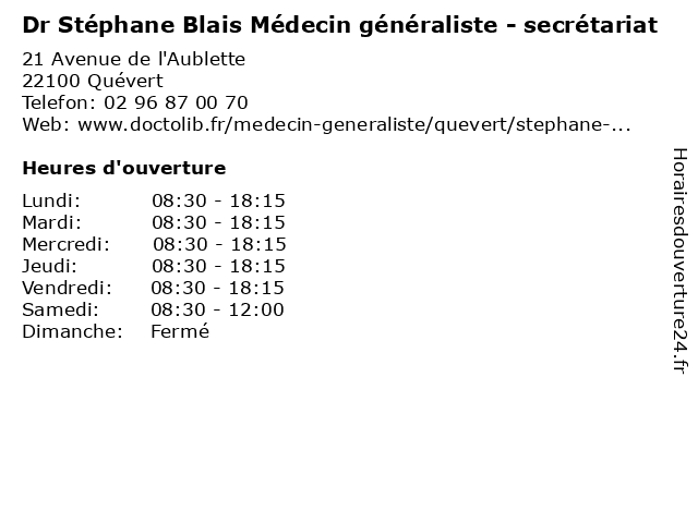 | Samedi | 08:30-12:00 |