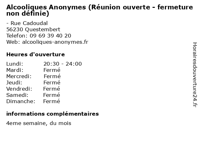 Termes de recherche pour Alcooliques Anonymes (Réunion ouverte - fermeture non définie):reunion, non, fermeture, ouverte, alcooliques, anonymes, définie, fermée |