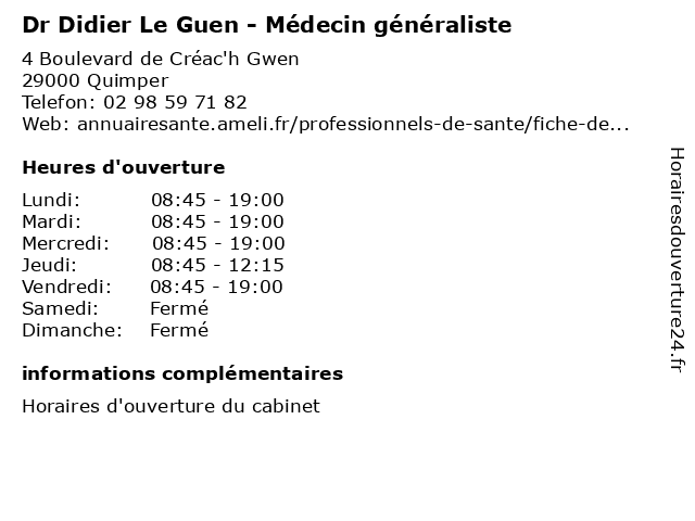 | Lundi | 08:45-19:00 |