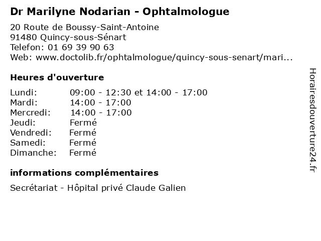 1 Dr Marilyne Nodarian - Ophtalmologue (Distance: 6,94 km) 18 Trait d'Union, 77127 Lieusaint consultation, docteur, dr, marilyne, med, médecin, médecine, nodarian, ophtalmologue, traitement 2 Dr Eliane Sinapoli - Ophtalmologue (Distance: 0,03 km) 20 Route de Boussy-saint-antoine, 91480 Quincy-sous-Sénart dr, eliane, ophtalmologie, ophtalmologistes, ophtalmologue, sinapoli, vision 3 Dr Marguerite Nyam-Ndes - Ophtalmologue (Distance: 2,13 km) 11 Avenue de la République, 77380 Combs-la-Ville dr, marguerite, ndes, nyam, ophtalmologie, ophtalmologistes, ophtalmologue, vision 4 Dr Marguerite Nyam-Ndes - Ophtalmologue (Distance: 2,23 km) 11 Avenue de la République, 77380 Combs-la-Ville consultation, docteur, dr, marguerite, ndes, nyam, ophtalmologie, ophtalmologue, santé 5 Dr Pascal Kogon - Ophtalmologue (Distance: 5,27 km) 3 Rue du Marché, 77170 Brie-Comte-Robert docteur, dr, generaliste, kogon, medical, ophtalmologue, pascal, soin 6 Dr Jean-Luc Cadet - Ophtalmologue (Distance: 11,27 km) 70 Avenue du Général de Gaulle, 91170 Viry-Châtillon cadet, dr, jean, luc, ophtalmologie, ophtalmologistes, ophtalmologue, vision |