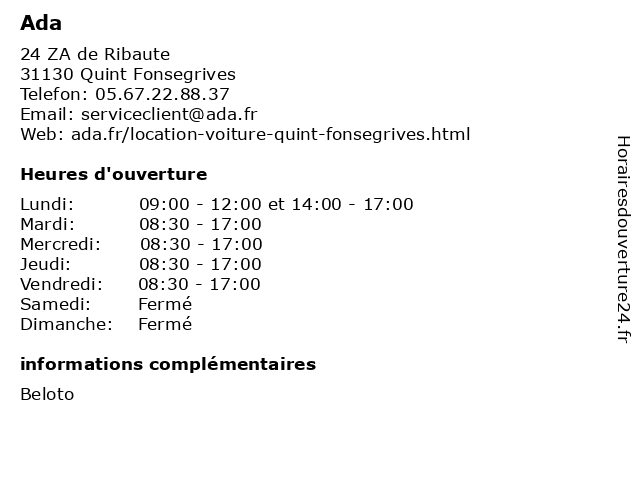 1 Ada (Distance: 3,83 km) - Chemin de Lalande, 31670 Labège ada, agences, demenagement, location, vehicules, voitures 2 ADA (Distance: 6,20 km) 25-27 Avenue de Lyon, 31501 Toulouse ada, auto, location de voiture, roulez, vehicules 3 Ada (Distance: 8,19 km) 88 av. des Etats Unis, 31200 Toulouse ada, agences, location, utilitaire, voiture 4 Ada (Distance: 8,96 km) 1 Avenue de Toulouse, 31750 Escalquens ada, agence, location, services, utilitaires, voitures, voyages 5 Ada (Distance: 14,60 km) 52 Rue de Fenouillet, 31140 Saint Alban ada, agences, demenagement, location, vehicules, voitures 6 Ada (Distance: 17,43 km) - Boulevard du Grand Castaing, 31600 Muret ada, agence, location, services, utilitaires, voitures, voyages |