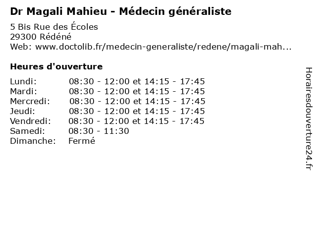 | Mardi | 08:30-12:00 et 14:15-17:45 |