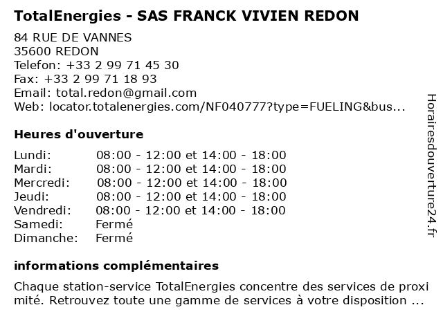 Termes de recherche pour TotalEnergies - SAS FRANCK VIVIEN REDON:redon, sas, vivien, total, franck, gas station, station service, tankstelle, totalenergies |