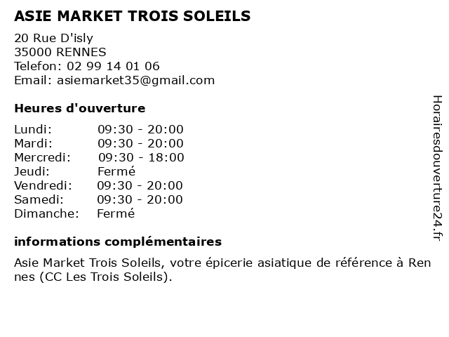 1 Carrefour Market (Distance: 0,03 km) 18 Rue D'isly, 35000 Rennes alimentation, carrefour, magasin discount, market, supermarché 2 Les Trois Soleil (Distance: 0,03 km) 20 Rue d 'Isly, 35000 Rennes les, rennes, restaurants, sarl, soleil, supermarché, trois 3 Crêperie 3 Soleils (Distance: 0,03 km) 20 Rue d' Isly, 35000 Rennes collations, creperie, crêperie, restaurants, soleils 4 Regus - Rennes, 3 soleils (Distance: 0,03 km) Immeuble 3 Soleils, 35000 Rennes espace de coworking, regus, rennes, soleils 5 Soleil d'Asie (Distance: 0,04 km) 18 Rue d'Isly / Les Trois Soleils, 35000 Rennes bar, bistro, bistrot, brasserie, café, d'asie, pub, restaurant, restauration, resto, soleil, traiteur 6 |